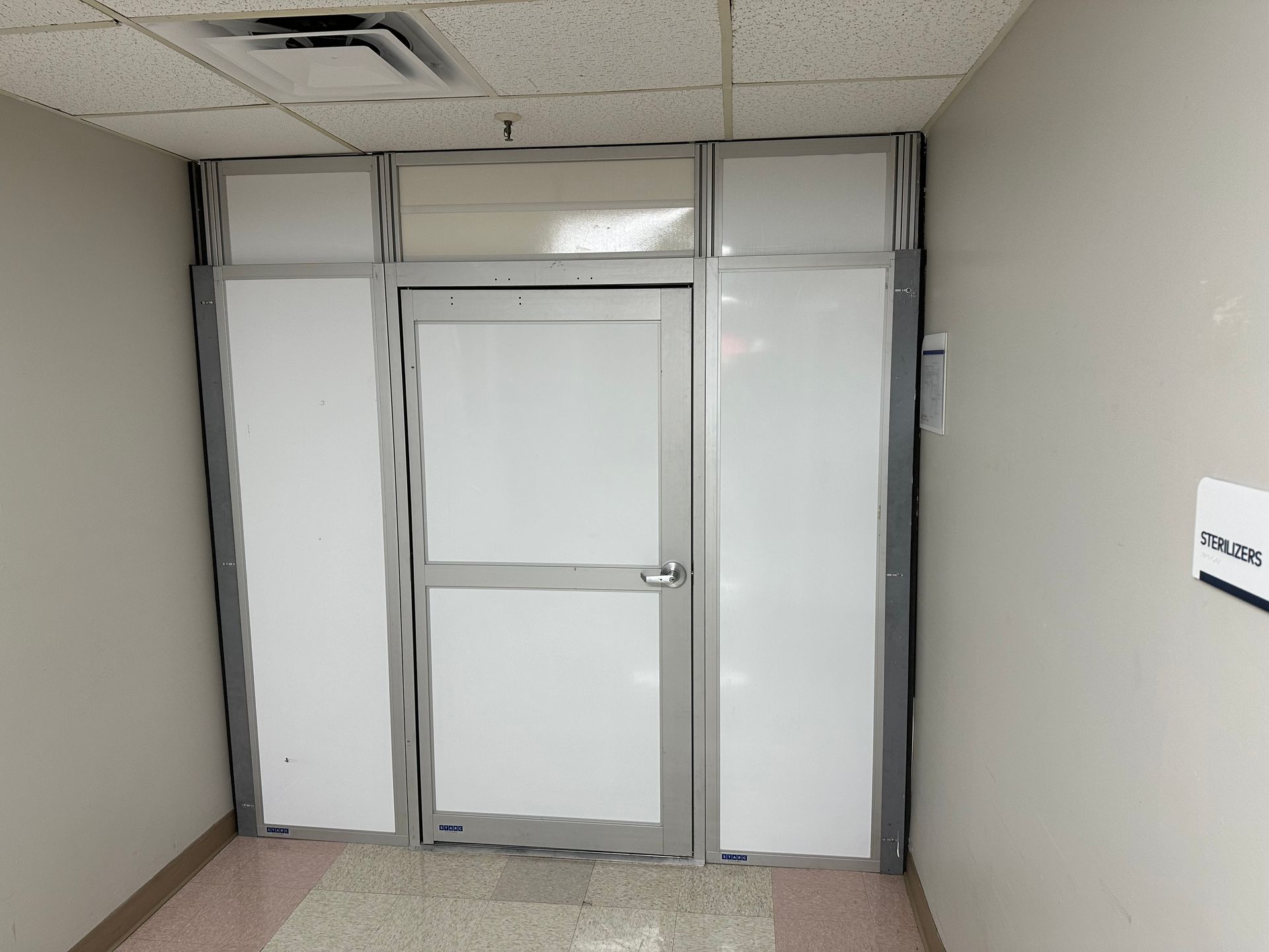 The height of the panels can be adjusted as they extend from 6’10” to 13”. The panels then attach to the floor via a rubber gasket that provides an airtight seal and superior grip for stability. The top of the panel contains a gasket as well, that provides an airtight seal. Ceiling grid clips are used to anchor the top of the panels to the ceiling grid to provide rigid stability.